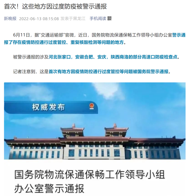 很显然,杨师傅遭遇的麻烦事是基层执行防疫政策过程中层层加码、造成防疫过当导致的。这样的事情并非个例,也并非头一次发生。就在6月11日交通运输部发布的《国务院物流保通保畅工作领导小组办公室警示通报》中,张家口某高速路口刚刚被点名通报,地方政府也表示已经整改完成。而短短几天后又发生类似事件,且更为荒谬,人们不禁要问:为何相关部门三令五申,依然屡禁不止?简单粗暴的过度防疫何时休?媒体曝光的这次事件仅是偶然事件吗,那些没有曝光的、时时处处可能发生的借由防疫设置的不合理障碍,还在给多少货车司机带来不必要的烦恼,造成多少不必要的损失?
